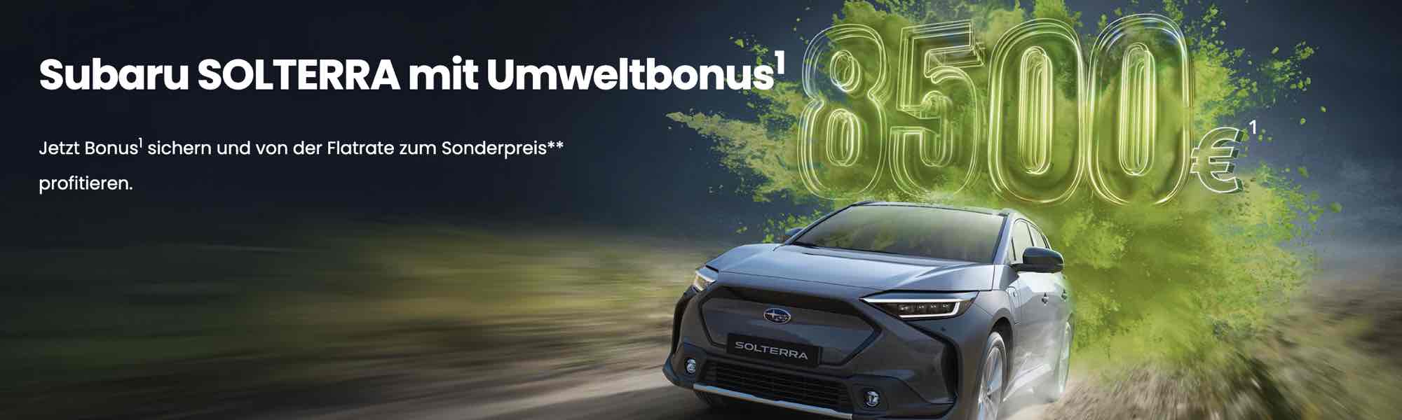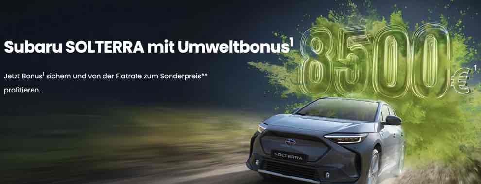 1 Die Aktion gilt vom 29.12.2025 bis 31.03.2026 in Verbindung mit dem Kauf eines sofort verfügbaren Subaru SOLTERRA (Vorführwagen und junge Gebrauchtwagen), Zulassung/Besitzumschreibung bis 31.03.2026 bei teilnehmenden Subaru Partnern. Die Aktion wird gemeinsam von der SUBARU Deutschland GmbH und den teilnehmenden Subaru Partnern getragen und ist mit allen Aktionen der SUBARU Deutschland GmbH für das Modell SOLTERRA kombinierbar. Sie sparen 8.500,- €. Weitere Detailinformationen erhalten Sie bei Ihrem teilnehmenden Subaru Partner oder unter www.subaru.de.